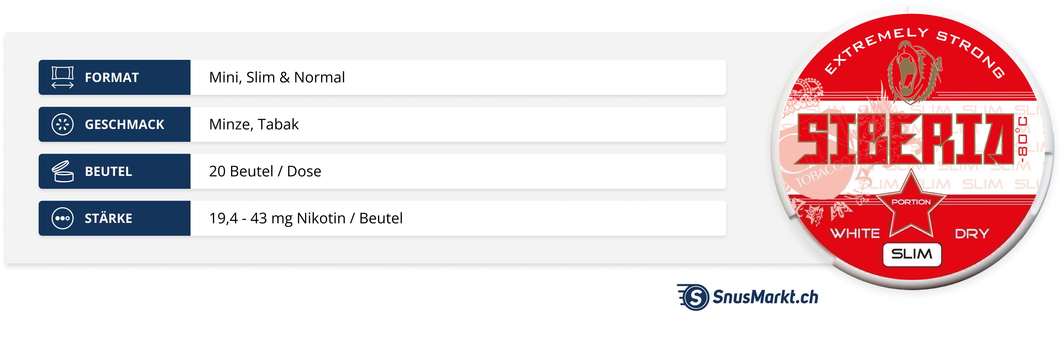 Siberia ist extrem stark, mit etwa 43 mg Nikotin pro Gramm. Im Vergleich zu anderen Snus-Marken ist das eine sehr hohe Dosis und somit deutlich stärker als viele andere Snusmarken, teilweise fünfmal so stark. Deshalb sollten unerfahrene Nutzer:innen vorsichtig sein, da die Wirkung sehr intensiv sein kann.