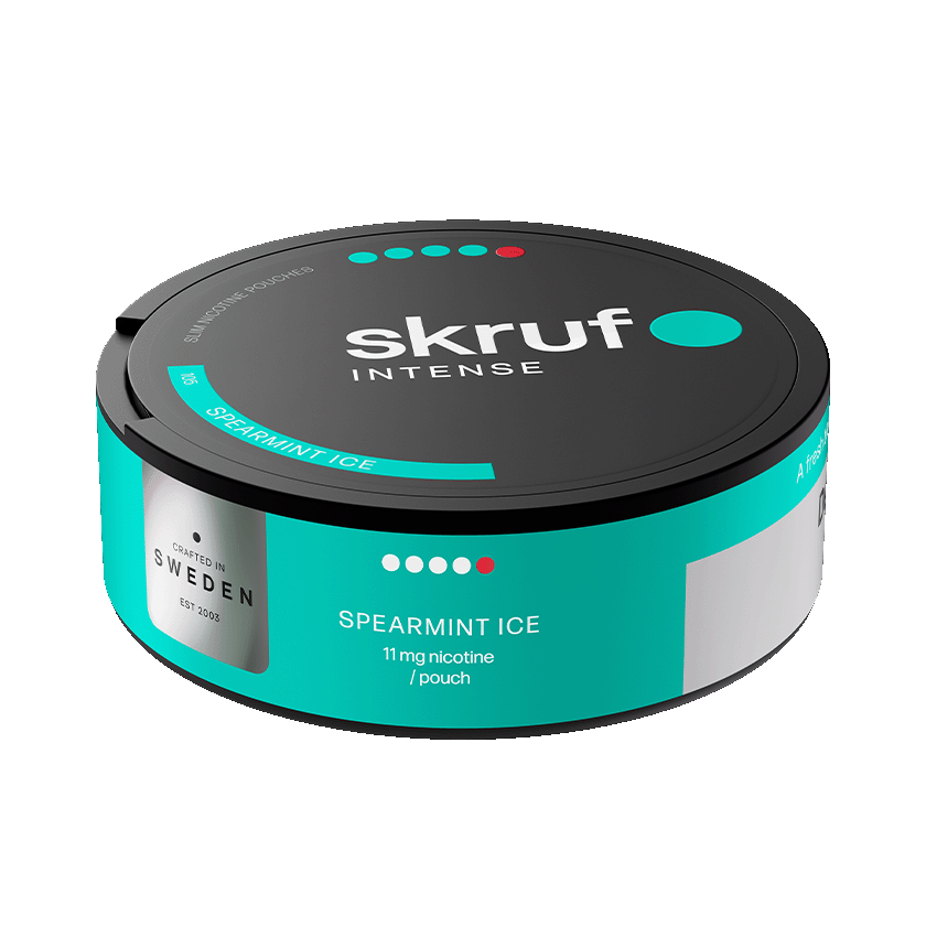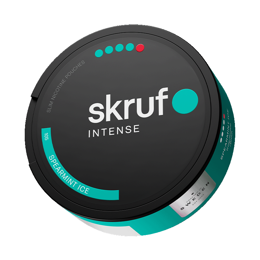 Die Marke Skruf Intense präsentiert Skruf Intense No.105 Spearmint Ice S4 mit den Aromen Spearmint, Eukalyptus und Pfefferminze. Das Produkt ist extra stark und enthält 20 Beutel im Slim-Format pro Dose.